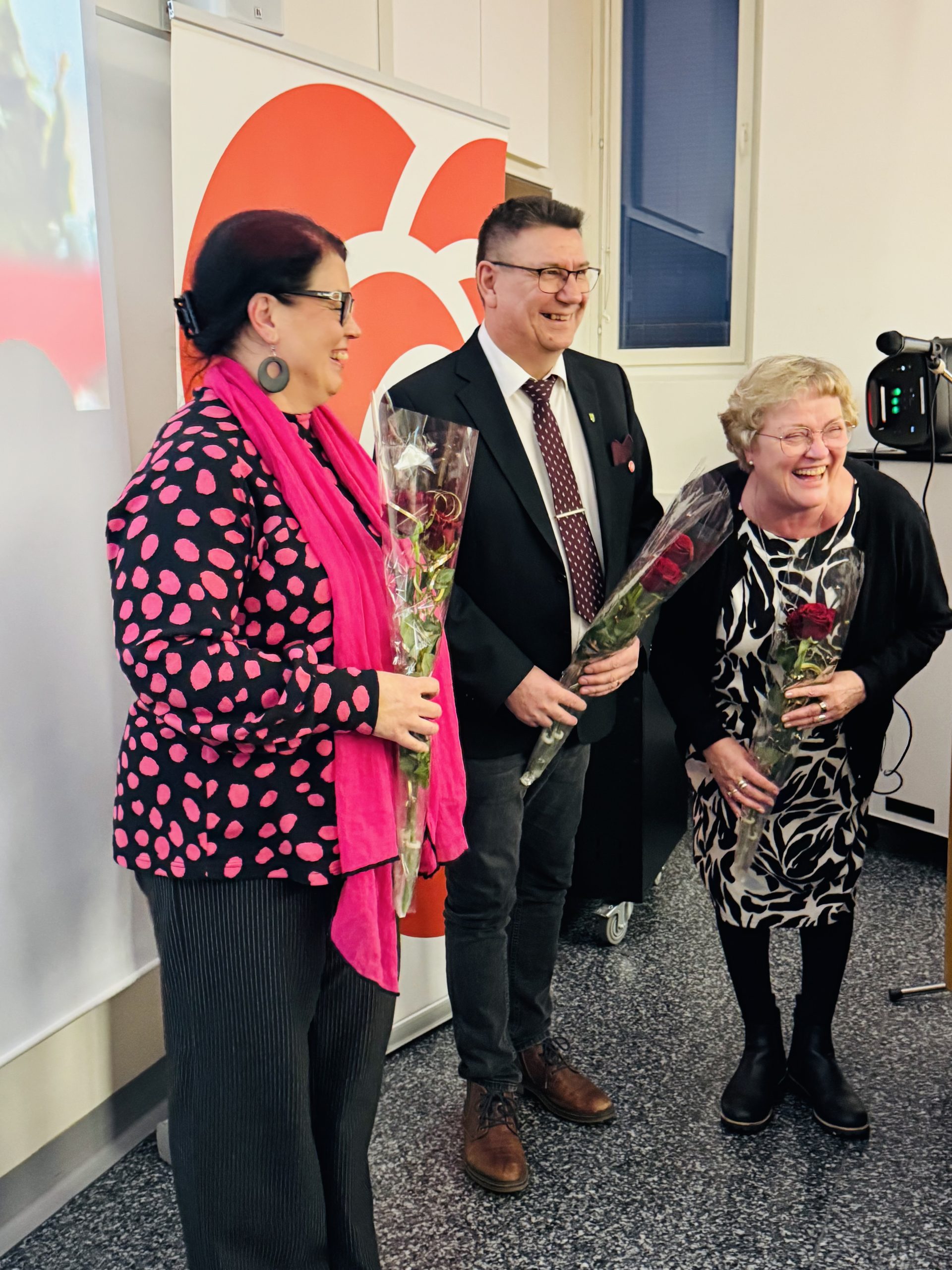 SDP:n Oulun piirin tuore puheenjohtajisto kukitettiin iloisissa tunnelmissa. Kuvassa vasemmalla Marjo Kangasharju, keskellä Jari Männikkö ja oikealla Pirjo Sirviö.